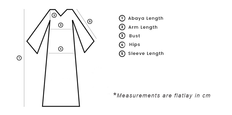📌 Tip: If you prefer a looser or more relaxed fit, consider sizing up for extra comfort. For a custom-made abaya, contact us with your measurements, and we’ll create the perfect fit just for you!